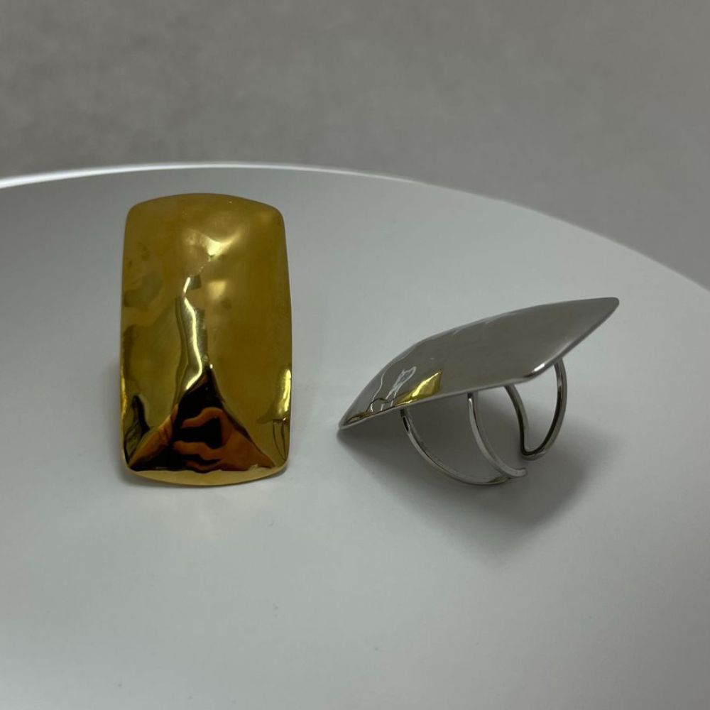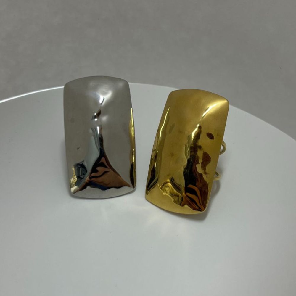 Δαχτυλίδι σφυρήλατο ανοιγόμενο σε σχήμα ορθογώνιο, από ανοξείδωτο ατσάλι σε χρυσό και ασημί χρώμα.